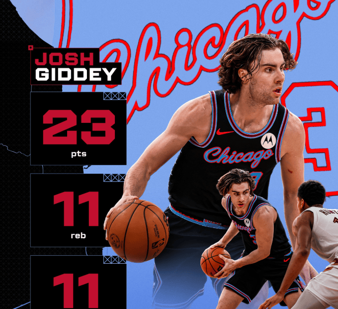 本场比赛,公牛球员约什-吉迪出战33分钟,18投8中,其中三分球11投5中,罚球2投2中,获得23分11篮板11助攻2抢断1封盖。